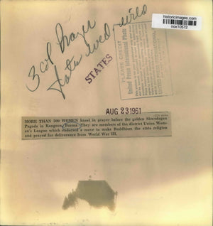 More than 300 women kneel in prayer before the golden Shwedagon Pagoda in Rangoon, Burma. They are members of the district Union Women's League which endorsed a move to make Buddhism the state religion and prayed for deliverance from World War III.