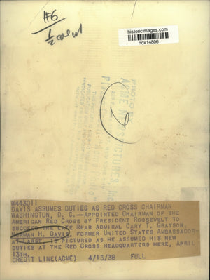 Appointed chairman of the American Red Cross by President Roosevelt to succeed the late Rear Admiral Cary T. Grayson, Norman H. Davis, former United States Ambassador-at-large, is pictured as he assumed his new duties at the Red Cross headquarters here, April 13th.