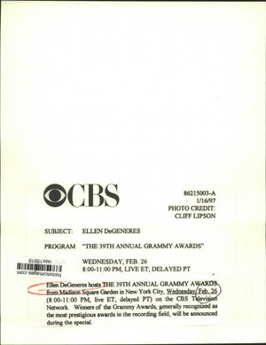 Ellen DeGeneres hosts THE 39TH ANNUAL GRAMMY AWARDS from Madison Square Garden in New York City, Wednesday/February 26 (8:00-11:00 PM, live ET, delayed PT) on the CBS Television Network Winners of the Grammy Awards, generally recognized as the most prestigious awards in the recording field, will be announced during the special.