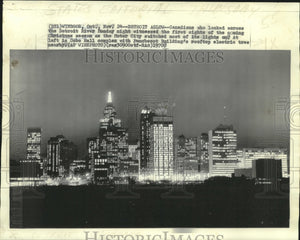 Windsor, Ontario - Detroit aglow -- Canadians who looked across the Detroit River Monday night witnessed the first sights of the coming Christmas season as the Motor City switched most of its lights on. At left is Cobo Hall complex with Penobscot Building's rooftop electric tree nearby.