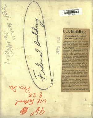 Dedication of the new $2,550,000 Federal Building here was to take place this afternoon with federal, state and city officials participating in the exercises. Walter Myers, fourth assistant postmaster of Washington, D.C., is scheduled to make the principal address. Other speakers will include A. Miles Pratt, President of the Federal Business Association; Commissioner of Finance Jess S. Cave; H. Grady Meador, President of the New Orleans Association of Commerce; Postmaster Joseph J. Ferguson of New Orleans; Paul H. Maloney Congressman for the Second District and J. O. Fernandez, Congressman from the First District.