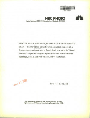 Hunter (Fred Dryer) stalks a murder suspect of a famous movie actress who is found dead in a park, in "Naked Justice," a special two-part episode on NBC-TV's "Hunter" Tuesdays, February 2 and 9 (9-10 p.m. NYT; in stereo).