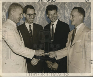 The Isadore Dyer Memorial Prize awarded to the senior with the highest average during four years at Tulane University Medical School, is presented by Dr. Maxwell E. Lapham, Dean to Shia H. Elson, New Orleans. From left are Dr. Lapham; Dr. Oscar Creech, Jr., Chairman of the School's Department of Surgery; Herbert Ichinose, of Hawaii, winner of the John Herr Musser Memorial Prize, and Elson.