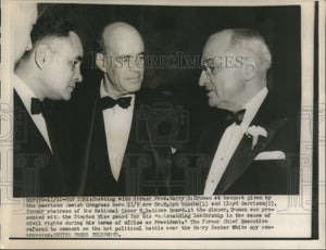 Chatting with former President Harry S. Truman at banquet given by the American Jewish Congress here 11/9 are Dr. Ralph Bunche (L) and Lloyd Garrison (C), former chairman of the National Labor Relations Board. At the dinner, Truman was presented with the Stephen Wise Award for his "outstanding leadership in the cause of civil rights during his terms of office as President." The former Chief Executive refused to comment on the hot political battler over the Harry Dexter White spy controversy.
