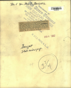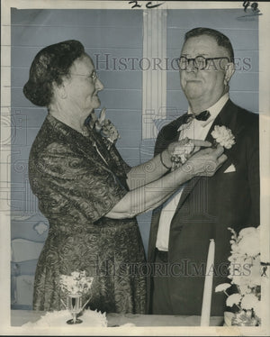 Pinning a flower on her husband as they celebrate their golden wedding anniversary is Mrs. George E. Gouguet Sr. The couple, both natives of New Orleans, reside at 2200 Gallier and were married 50 years ago at Holy Trinity church. They have three children, eight grandchildren and four great-grandchildren. The celebration was held at the home of a daughter, Mrs. W. A. Authement, 2109 Mazant.