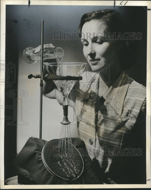 1955 Press Photo Good Housekeeping Laboratory Worker Tests Water Repellent Cloth