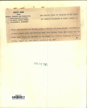 Ann Harding stars in "Miracle in the Night" on "Schlitz Playhouse of Stars" August 14 Guest star-hostess Ann Harding plays a wealthy old penny-pincher contemptuous of poor people until she ventures away from Beekman Place and learns how the other half lives in "Miracle in the Night" on "Schlitz Playhouse of Stars," Friday, August 14, over CBS-TV (9:00-9:30 PM, EDT).