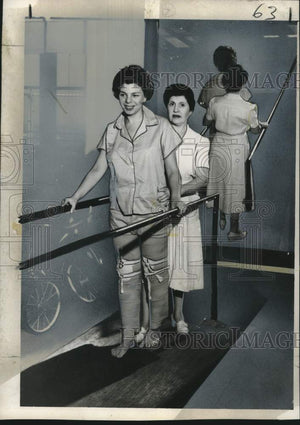 1955 Press Photo Polio Victim learning to walk again with assistance from woman