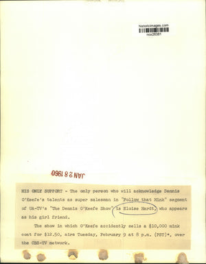 The only person who will acknowledge Dennis O'Keefe's talents as super salesman in "Follow that Mink" segment of UA-TV's "The Dennis O'Keefe Show" is Eloise Hardt, who appears as his girl friend. The show in which O'Keefe accidentally sells a $10,000 mink coat for $12.50, airs Tuesday over CBS-TV network.