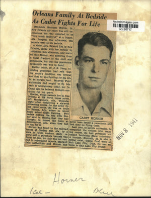 Orleans Family At Bedside As Cadet Fights For Life. Benjamin Harrison Horner, Junior, New Orleans air cadet was still unconscious but was reported to be "very much improved" as a Jasper, Alabama hospital this afternoon. His parents were at his bedside. A sister, Mrs. Edward Lea of New Orleans, spoke with her mother by telephone this afternoon, and learned that Horner, was suffering from a basal fracture of the skull and pneumonia, but that the pneumonia apparently was well in hand.