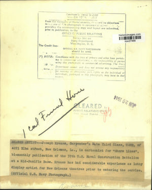 Seabee artist - Joseph Krauss, Carpenter's Mate Third Class, USNR, of 4221 Elba Street, New Orleans, Louisiana, is a cartoonist for "Shore Lines," bi-monthly publication of the 39th U.S. Naval Construction Battalion at a Mid-Pacific base. Krauss has had considerable experience as a lobby display artist for New Orleans theatres prior to entering the service.