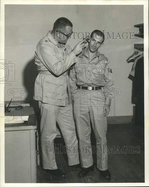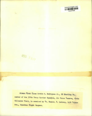Airman First Class Archie A. Rodriguez Jr., 29 Sherling Drive, member of the 357th Troop Carrier Squadron, Air Force Reserve, Alvin Callender Field, is examined by Dr. Donald B. Lathrop, 1430 Tulane Avenue, Squadron Flight Surgeon. New Orleans