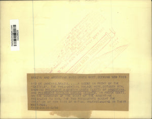 Brazil and Argentine presidents meet, seeking new ties Rio de Janeiro, Brazil . . . A scene in front of the "Cattele," the presidentail palace here October 9th, showing President Augustin Justo (left) of Argentina and President Getulio Vargas (right, in frock coat) on the occasion of the visit of the Argentine president to Rio. The two presidents sought the creation of new ties of mutual understanding in their meetings.