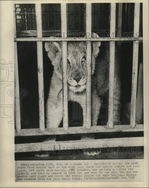 Oklahoma City, November 24 - Caged cat - Bewildered George the lion peers from behind bars at the city jail where his master lodged him last night. Ted Moore said George, a 70 pounder, was getting a little too playful and that he wanted to turn the cat over to the zoo. The zoo was closed last night and Moore had George jailed for safe keeping. George was removed from the jail early today.