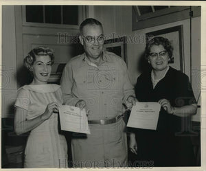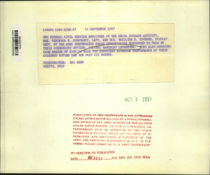 Two federal civil service employees of the Delta Storage Activity, Mrs. Veronica S. Constnacy, left, and Mrs. Bazilide D. Trouard, display Department of the Army performance award certificates presented to them by their commanding officer, colonel McWesley Ledbetter. They also received cash awards of $100.00 each for sustained superior performance of their assigned duties for the last six months.