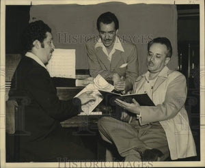 A trio of opera headliner singers warming up in New Orleans. A trio of headliners from the "Opera Under the Stars" series to be staged here who arrived in New Orleans yesterday are pictured above in a warmup session for "Cavalleria Rusticana" and "Pagliacci" in which they will appear Friday and Saturday nights at City Park Stadium. The stars are, left to right, George Lipton, bass-baritone, New York; Rodolpho Hoyos, baritone, South America; and Frank Richards, baritone, Newark, New Jersey.