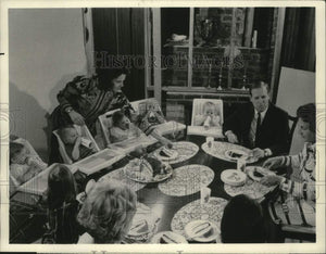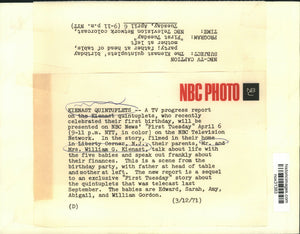 Kienast Quintuplets - A TV progress report on the Kienast quintuplets, who recently celebrated their first birthday, will be presented on NBC News' "First Tuesday" April 6 (9-11 p.m., New York time, in color) on the NBC Television Network. In the story, filmed in their home in Liberty Corner, New Jersey, their parents, Mr. and Mrs. William G. Kienast, talk about life with the five babies and speak out frankly about their finances. This is a scene from the birthday party, with father at the head of table and mother at left. The new report is a sequel to an exclusivie "First Tuesday" story about the quintuplets that was telecast last September. The babies are Edward, Sarah, Amy, Abigail, and William Gordon.