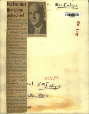 Pick MacIntyre new Eastern Air Lines head Malcolm A. MacIntyre, who resigned this past July as undersecretary of the U.S. Air Force, has been elected president and chief executive officer of Eastern Air Lines effective October 1. MacIntyre succeeds both Captain Eddie Rickenbacker, chief executive officer of the company since its organization in 1938, and Thomas F. Armstrong, Eastern's president since 1953.