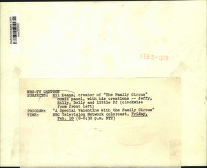 Subjects: Bill Keane, creator of "The Family Circus" comic panel, with his creations - Jeffy, Billy, Dolly and Little PJ (clockwise from front left) Program: "A Special Valentine with the Family Circus" Time: NBC Television Network colorcast, Friday, February 19 (8-8:30 p.m., New York time)