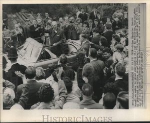 Prime Minister Harold Macmillan waves to the crowd surrounding his car in Middleton, England, when he addressed an outdoor crowd Wednesday. This was Macmillan's first full day of his planned 2,000-mile tour in connection with next month's general election.