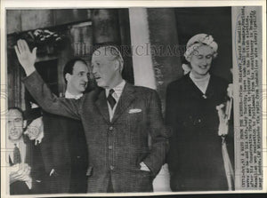 Prime Minister Harold Macmillan waves as he and his wife, Lady Dorothy, leave the town hall in Bromley, England, after his Conservative Party swept to victory in the British election. Macmillan won re-election to Parliament from his constituency in Bromley, near London.