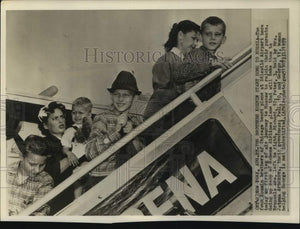 The four Kozmin brothers board a plane back to Russia. The four Kozmin brothers of Chicago board plane at Idlewild Airport here today on first leg of air journey to Moscow to rejoin their parents. Going up ramp of Savena Airlines plane that will take them to Brussels are, left to right, Richard, 12; Peter, 3, held by Mrs. Jatyma Arbekova, their governess; Paul, 10, and George, 11. Woman helping George is not identified.