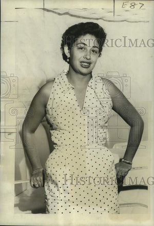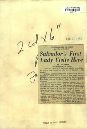 Senora Coralia De Lemus, the First Lady of El Salvador. The First Lady of El Salvador was in town today for just a few hours but she proved herself a fast worker. Arriving late yesterday from San Salvador, Senora Coralia de Lemus, wife of President Jose Maria Lemus, promptly telephoned Cantinflas, famed Mexican comic who came here for The Item's Latin American Beauty Pageant. ....she worked fast. Senora Jose M Lemus