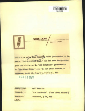 Fast-rising actor Gary Merrill, whose performance in the movie "Twelve O'Clock High" won him star recognition, gets top billing on the "ABC Playhouse" presentation of "The Giant Killer" over the ABC Radio Network on Thursday, April 30, from 9 to 9:30 p.m., EST.