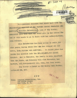 In a personalal decision that would meet with the wholehearted approval of the daytime serial character she portrays, Mercedes McCambridge, lead of "Big Sister," announced this week that she would give up her career the end of this month to go to Haiti with her author-husband, John Fifield. Miss McCambridge has been acting in radio for nine years, during which time she has covered all air waves, both daytime and nighttime. In recent years her income has spiraled into the $25,000-$30,000 annual bracket. But to Mercedes, the family is more important than the funds, and February will find Mercedes, her husband, and five-year-old son, John, San Juan bound.