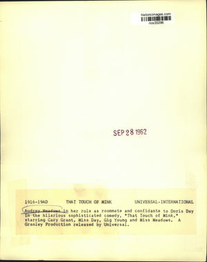 Actress Audrey Meadows stars in "That Touch of Mink". Audrey Meadows in her role as roommate and confidante to Doris Day in the hilarious sophisticated comedy, "That Touch of Mink," starring Cary Grant, Miss Day, Gig Young and Miss Meadows. A Granley Production released by Universal.