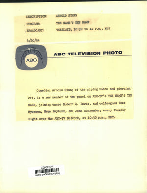 Comedian Arnold Stang of the piping voice and piercing wit, is a new member of the panel on ABC-TV's "The Name's The Same," joining emcee Robert Q. Lewis, and colleagues Bess Myerson, Gene Rayburn, and Joan Alexander, every Tuesday night over the ABC-TV Network, at 10:30 p.m., EDT.