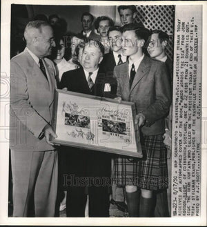Truman, Harry S. (United States President). Washington, D.C. President Truman today received an autographed cover of the book, "Hands Across the Sea" from John Robson, right, of Edinburgh, Scotland, one of 22 kids from 21 countries outside the Iron Curtain, who called on the President today at end of their United States Trip. Stillman Evans, publisher of the Nashville Tennessean In Center.