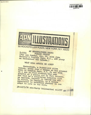 Baboons. Hackenbush, a 3-year-old Olive Baboon, muses over a banana at his present home in Hampton Bays, New York. He was born in a zoo in this country, and was adopted at 3 months old by Phil Ketover. Now that he's outgrowing domestic life in America, Ketover is taking him off to Africa, to Tanzania, in a unique experiment to determine whether he can adapt to life in the wild.