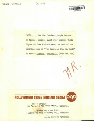 Wilde, Cornell (Films). Like the fearless jungle beasts he trains, special guest star Cornell Wilde fights to free himself from the bars of the training cage of "The Greatest Show On Earth" on ABC-TV Tuesday, January 21 (9-10 pm, PST). Cornell Wilde, "The Greatest Show On Earth" - "Big Man From Nairobi", Tuesday, January 21, 9-10 pm, PST.