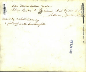 Dogs - Collie (Eldredge Show Dog). Blue Merle Collie male - Blue Duke O. Dorileen, bred by Mrs. L.R. LaBrasse, Dorileen Kennels. Owned by Isabelle Eldredge & pictured with her daughter.