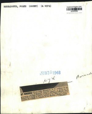 Bernadotte, Folke (Count) (& Wife). Count Folke Bernadotte, United Nations mediator in the Arab-Jewish Palestine dispute, is shown as he greeted his wife June 23 on her arrival on the Island of Rhodes where Bernadotte is trying to effect a solution to the Holy Land problem. Countess Bernadotte is a member of the Manville asbestos family.