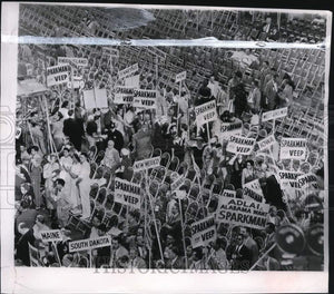 Democratic National Convention - 1952. Parade for Sparkman amid empty seats - The parade for Senator John Sparkman, complete with state standards and signs, wends its way through an area of vacant delegate seats after he was placed in nomination as vice presidential candidate before convention Saturday.