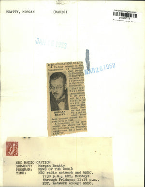 Beatty, Morgan (Radio). "Inauguration Day", a 5 1/2-hour telecast of the Inauguration of President-elect Dwight D. Eisenhower highlights the week for televiewers in the Pacific Northwest. The first Republican inauguration in 20 years will be the first to be seen live here on television. Seattle had one television station when President Truman started his 4-year term in 1949. Morgan Beatty, New of the World, National Broadcasting Company radio network and W National Broadcasting Company, 7:30 p.m., EST, Mondays through Fridays; 11:15 p.m., EST, network except W National Broadcasting Company.
