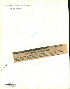 Railroads - Northern Pacific. Tacoma, Washington. Firemen battle flames bursting through the roof of a blacksmith building at the Northern Pacific Railway Company shops here last night. The fire of undetermined cause was quickly controlled. Damage is estimated at $20,000.