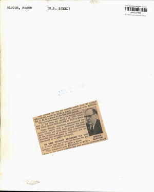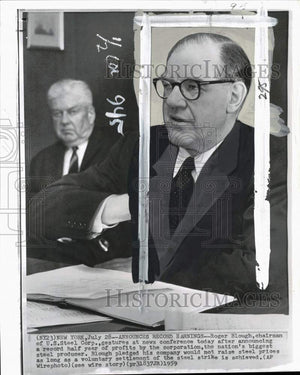 New York: Roger Blough, chairman of U.S. Steel Corp., gestures at news conference today after announcing a record half year of profits by the corporation, the nations biggest steel producer. Blough pledged his company would not raise steel prices as long as a voluntary settlement of the steel strike is achieved.