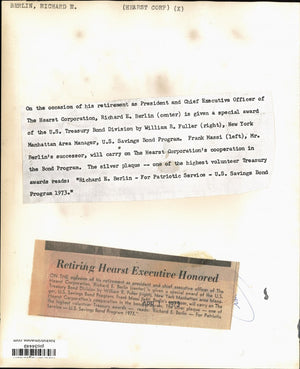Berlin, Richard E. (Hearst Corporation). On the occasion of his retirement as President and Chief Executive Officer of The Heart Corporation, Richard E. Berlin (center) is given a special award of the United States Treasury Bond Division by William R. Fuller (right), New York Manhattan Area Manager, United States Savings Bond Program. Frank Massi (left), Mr. Berlin's successor, will carry on The Heart Corporation's cooperation in the Bond Program. The silver plaque - one of the highest volunteer Treasury awards reads: "Richard E. Berlin - For Patriotic Service - United States Savings Bond Program 1973."