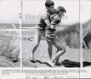 Films - S (Summer of '42). A skirmish on the beach grows out of hot tempers, hot days and youthful jealousy in a scene from "Summer of '42," the new Warner Bros. pictures directed by Robert Mulligan and produced by Richard A. Roth. The wrestling boys are Jerry Houser, left, and Gary Grimes.