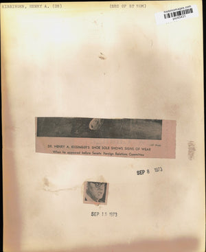 Kissinger, Henry A (Doctor) (Secretary of State Nominee). Washington. Doctor Henry A. Kissinger, his shoe sole showing signs of wear, gives testimony on his confirmation before the Senate Foreign Relations Committee Friday on Capitol Hill. He defended the wiretapping of several aides as painful but necessary to protect national security.