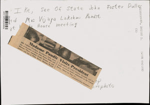 Eisenhower, Dwight D. (with groups), Ike, Secretary of State John Foster Dulles and Mrs. Vijaya Lakshmi Pandit at White House meeting - President Eisenhower holds attention of Secretary of State John Foster Dulles and Madame Vijaya Lakshmi Pandit Monday as pair confers with him at White House. Madame Pandit is president of United Nations Assembly and formerly served as India's ambassador to the United States.
