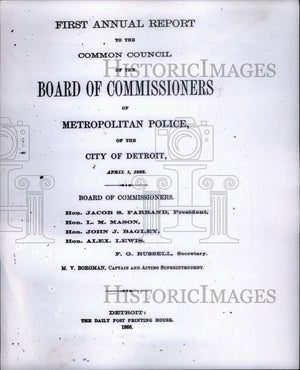 First Annual Report to the Common Council of the Board Of Commissioners of Metropolitan Police of the City of Detroit Hon Jacob S Farrand President ,Hon L.M Mason , Hon John J Bagley ,Hon Alex Lewis