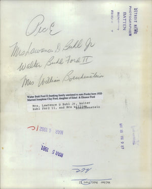 Mrs. Lawrence C Buhl Jr, Walter Buhl Ford II and Mrs. William Boeschenstein. Walter Buhl Ford II(banking family unrelated to auto Fords) born 1920 Married Josephine Clay Ford, daughter of Edsel & Eleanor Ford.