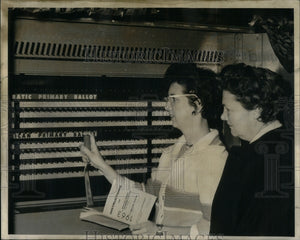 Margaret Kaeseberg and Angeline Vieau, election judges check out a voting machine set up in the lobby of the Gateway Theater for classes. The women were briefed by Stanley T. Kusper Jr.