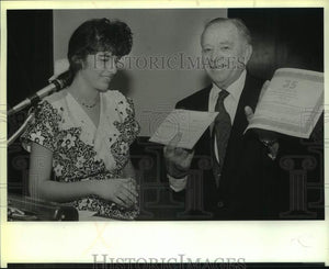 1989 Press Photo Sam Riklin with Sara Karam at Main Library Essay Contest Awards