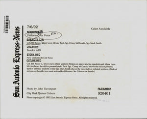 Keywords - Uniforms, Air Force; Subjects (L-R) - Col. Bill Rasco, Major Leon McLin, Tech. Sgt. Crissy McDonald, Sgt. Mark Smith; Location - Brooks AFB; Story info - New Uniforms for Air Force; Cutline info - Col. Bill Rasco (L) shows new officer uniform (Stripes on sleeve and no epaulets), and Major Leon McLin shows the old (or present) style. Tech. Sgt. Crissy McDonald shows the old (or present) type of enlisted uniform while Sgt. mark Smith shows the new style of enlisted uniform. (Style of stripes on shoulder are most noticeable difference. See Coburn for details.) (Texas)