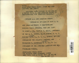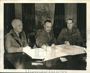 Commanding officers of both US and Canadian troops in Newfoundland discuss their commands They are L to R Col Maurice D Welty of US troops, Maj Gen WHP Elkins general officer of Atlantic Command and Brig Gen P Earnshaw of combined Canadian and Newfoundland forces